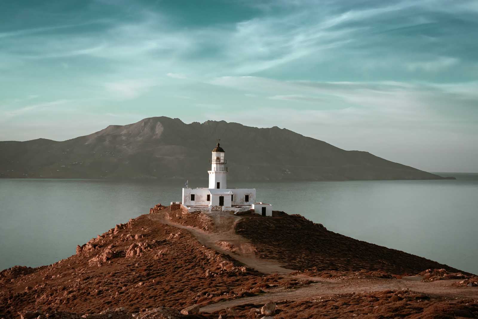 Latarnia morska znajduje się na północno -zachodnim wybrzeżu wyspy, gdzie będziesz mieć nieskrępowane widoki na kolorowy horyzont wraz z jeszcze mniejszą wyspą, Tinos. Łatwo tu się tu dostać, będąc tylko czteromilowym autobusem lub taksówką z miasta Mykonos.